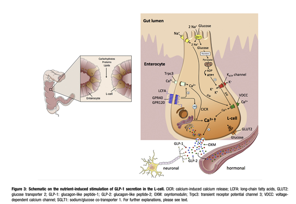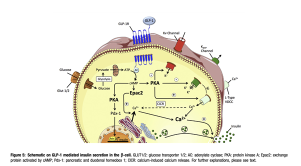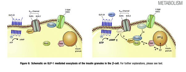 Door interactie met de GLP-1 receptor aan de buitenkant van de cel wordt er door die receptor meer cAMP gevormd, dit cAMP stimuleert de eiwitten PKA (Protein Kinase A) en (Epac-1) Exchange proteine activated by cAMP.