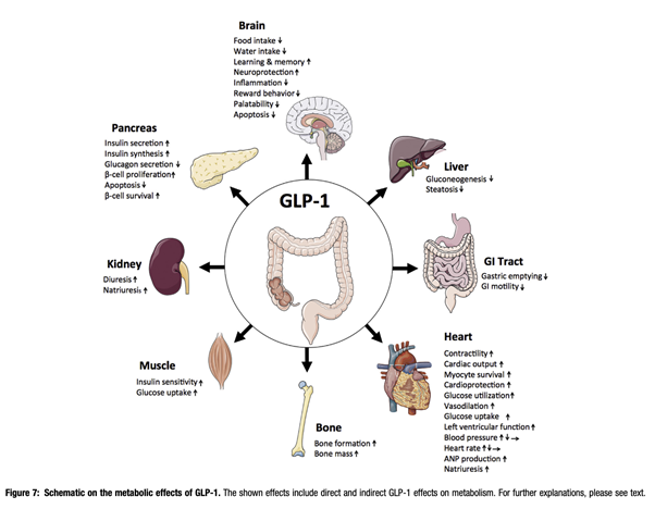 Stimuleert afgifte somatostatine en remt glucagonafgifte, glucagon wordt niet geremd bij hypoglykemie. In de hersenen geeft het gebruik van GLP-1 agonisten sneller een gevoel van verzadiging.
